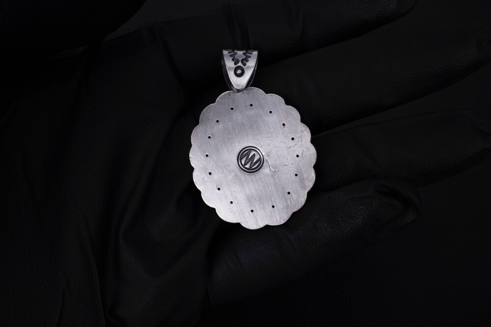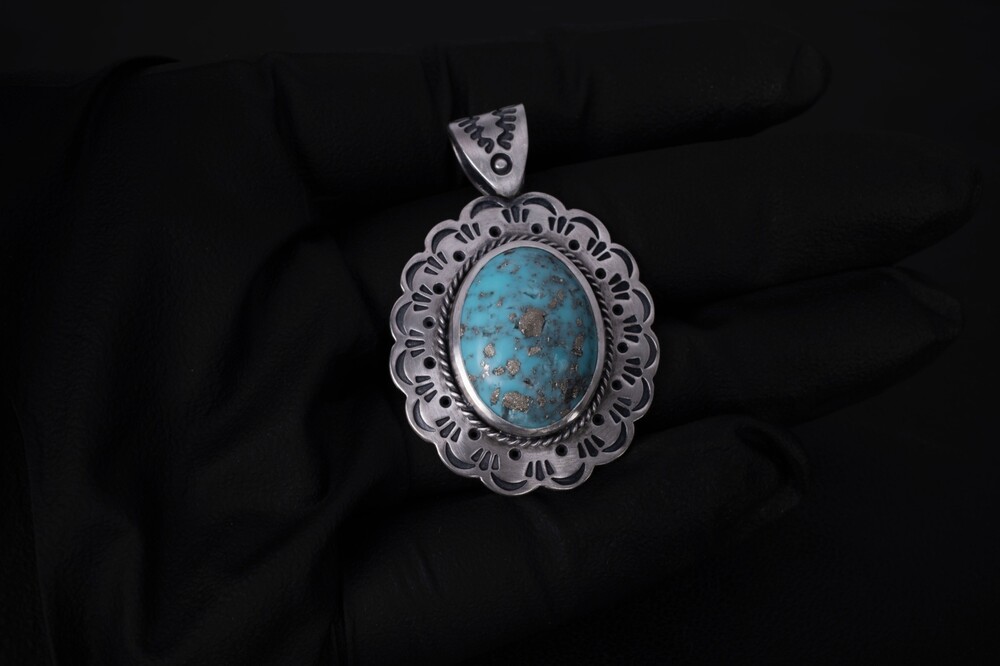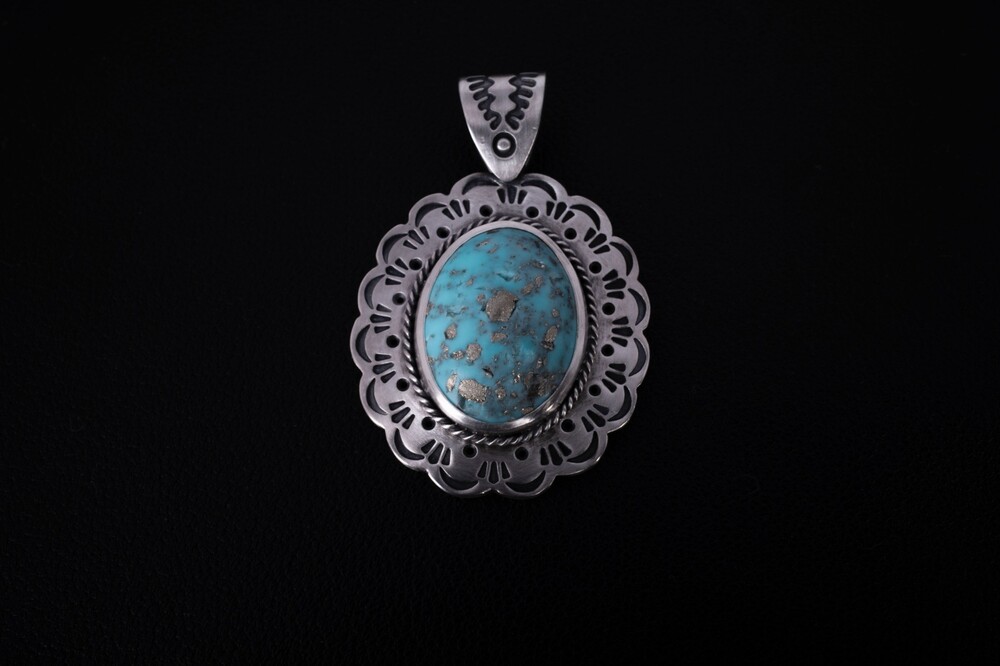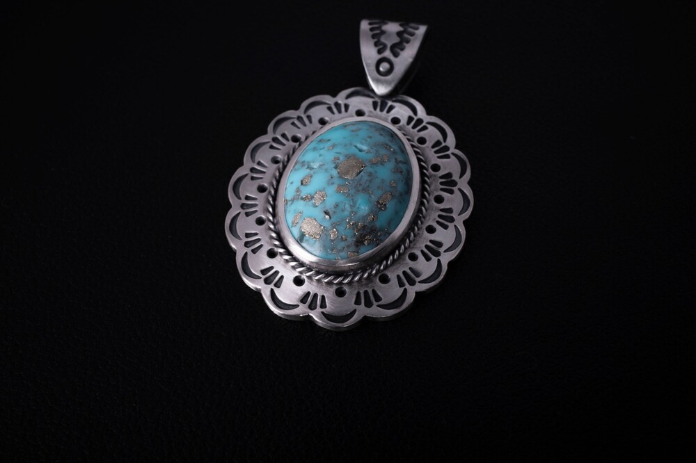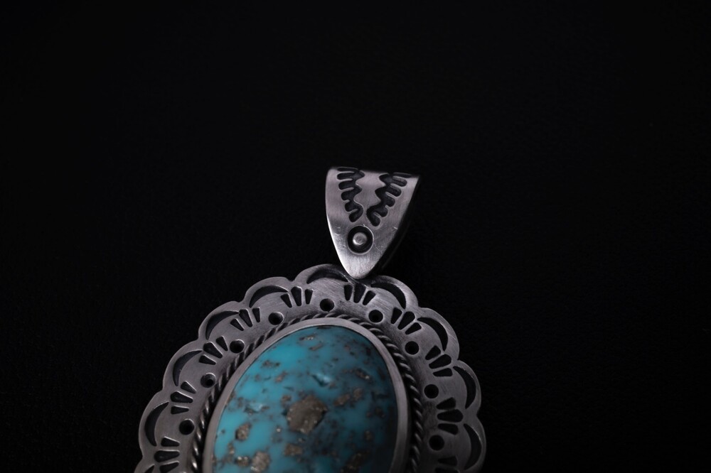 네이티브아메리칸스타일 디자인으로 제작된 스템핑 펜던트입니다. 스템핑/세공기법으로 제작되었으며, 메인에는 천연터키석이 세팅된 제품입니다.