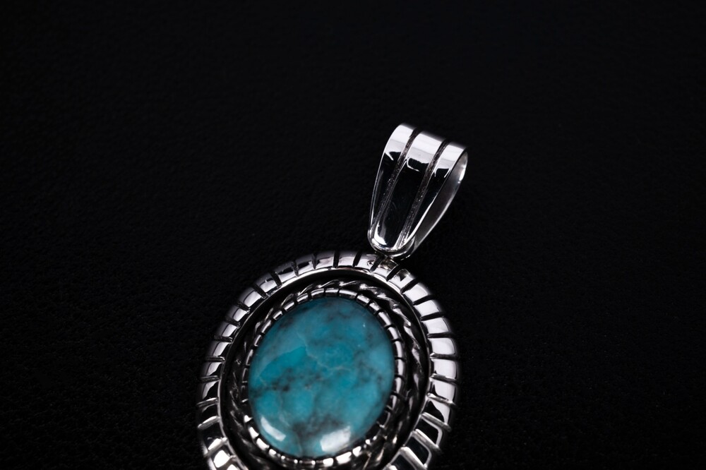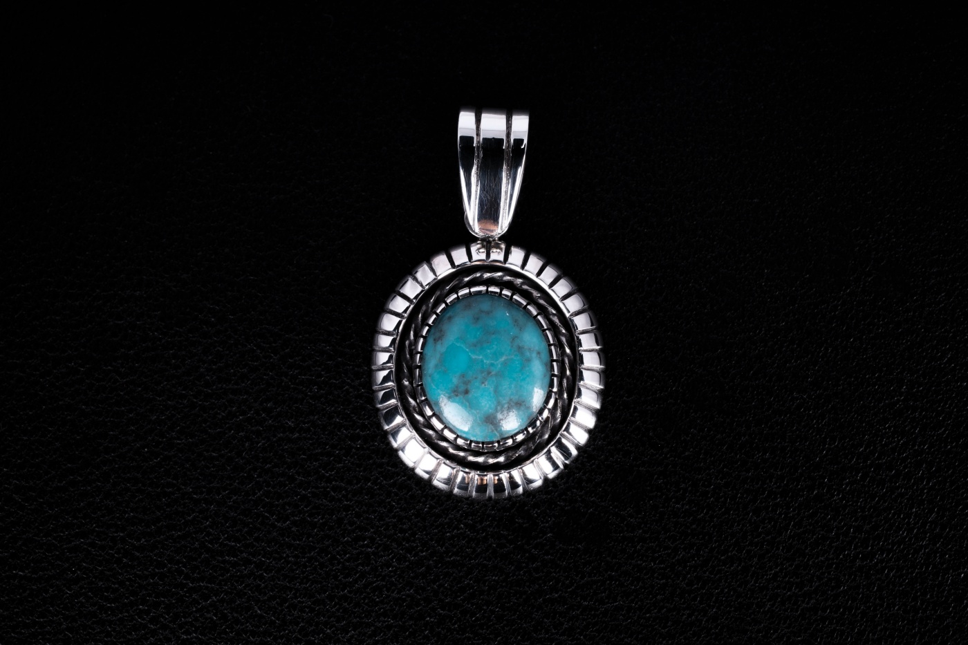 네이티브아메리칸스타일 디자인으로 제작된 원형 펜던트입니다. 세공기법으로 제작되었으며, 메인에는 천연터키석이 세팅된 제품입니다.