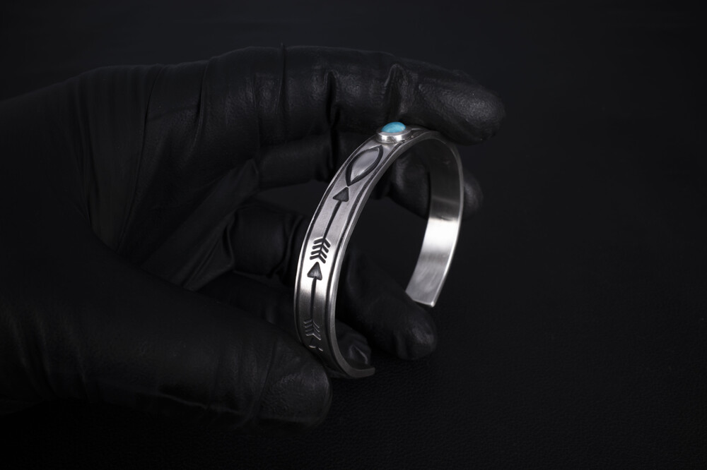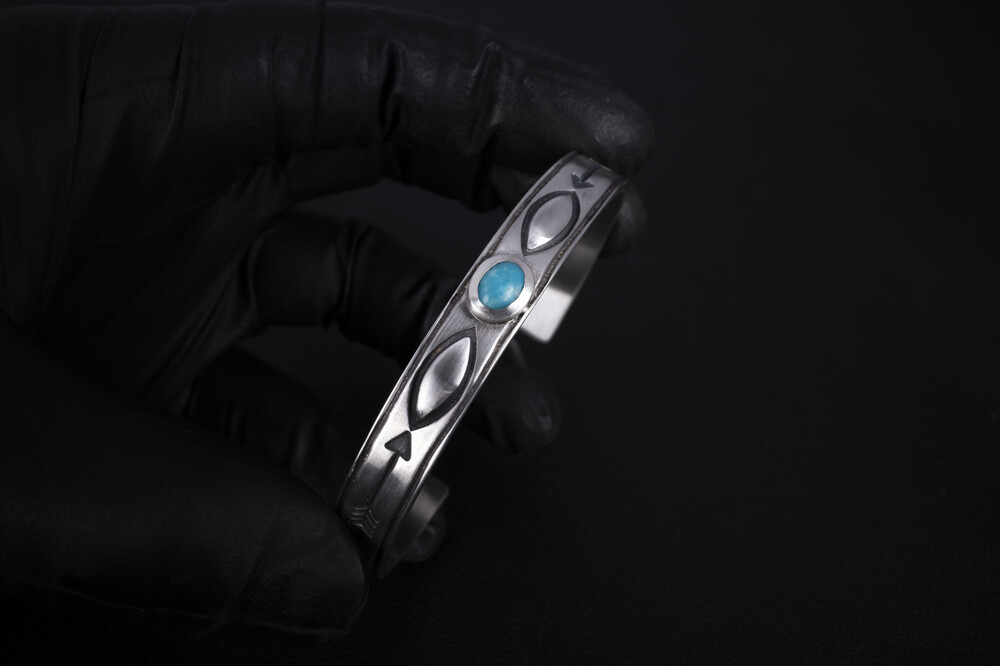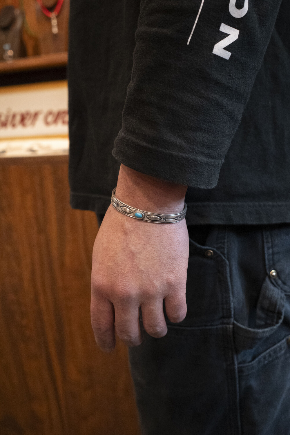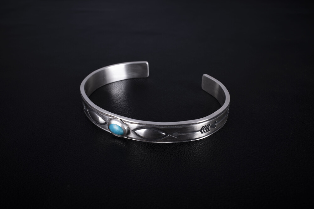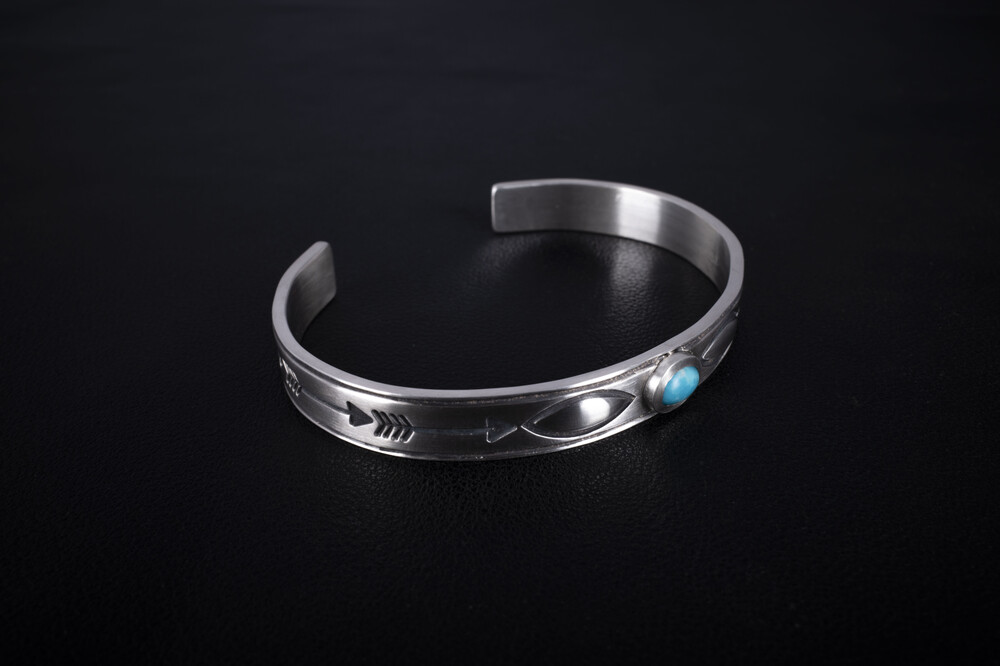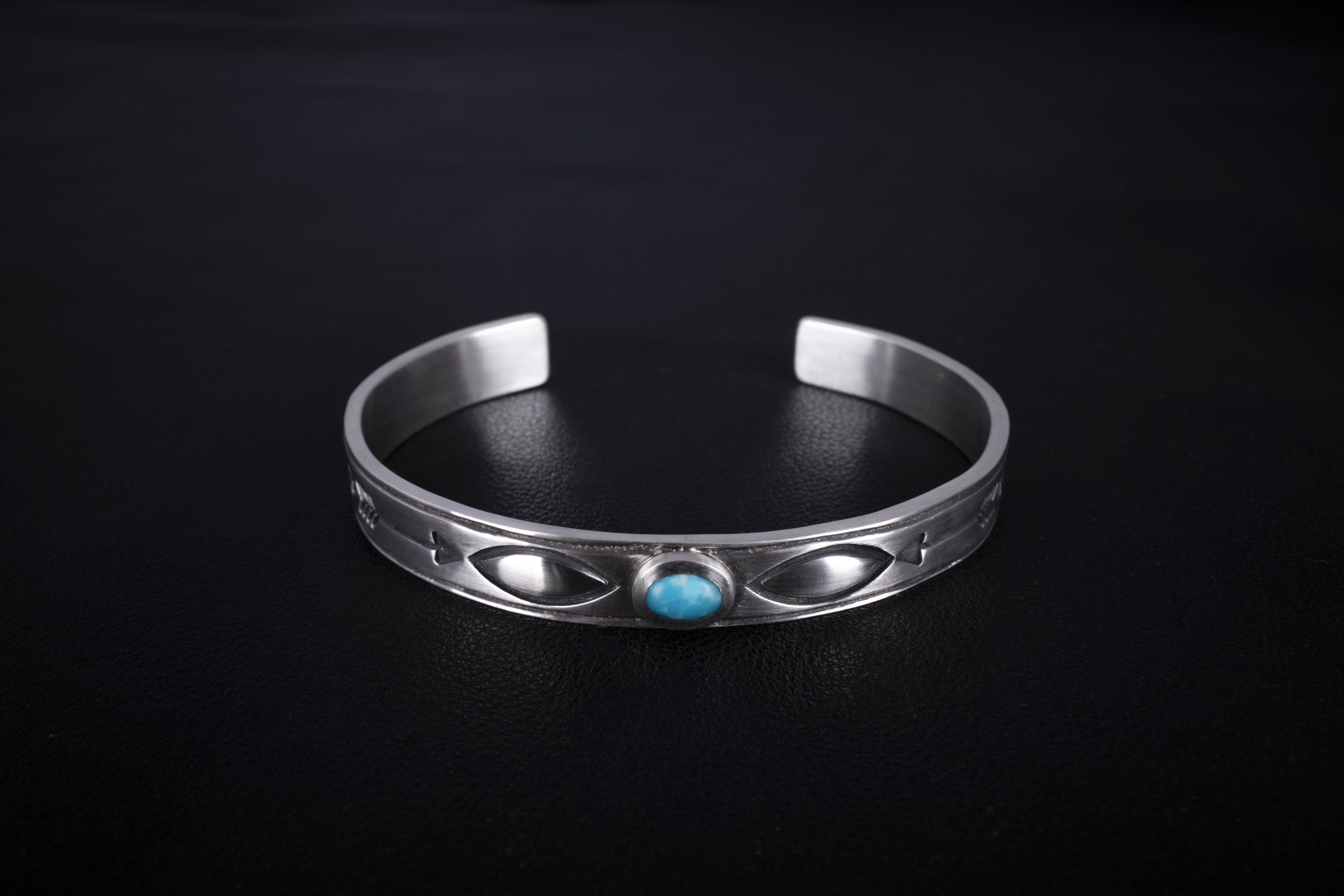 네이티브아메리칸 스타일로 제작된 터키석이 세팅된 뱅글입니다. 모든 공정 세공으로 제작된 스템핑 뱅글입니다.