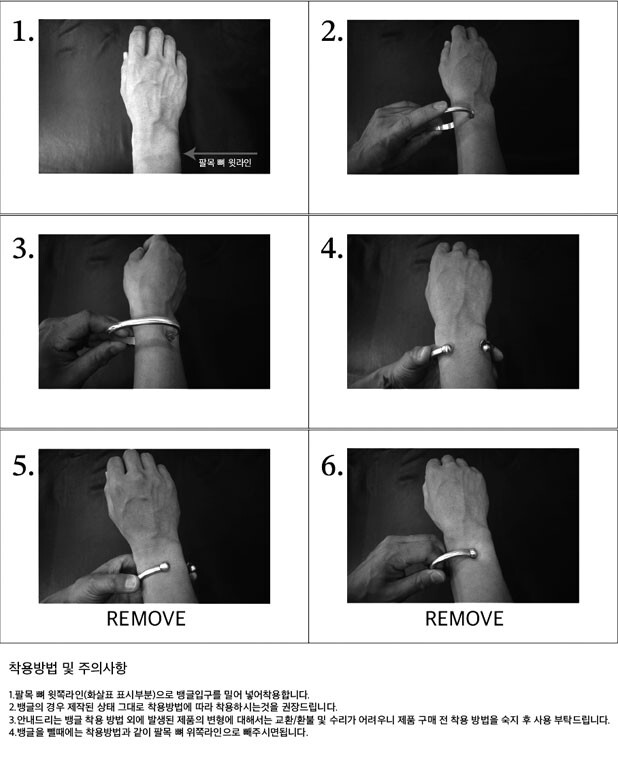 * 아래 안내드리는 뱅글 착용 방법 외에 발생된 제품의 변형에 대해서는 교환/환불이 어려우니 제품 구매 전 착용 방법을 숙지 후 사용 부탁드립니다.