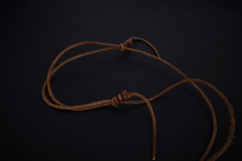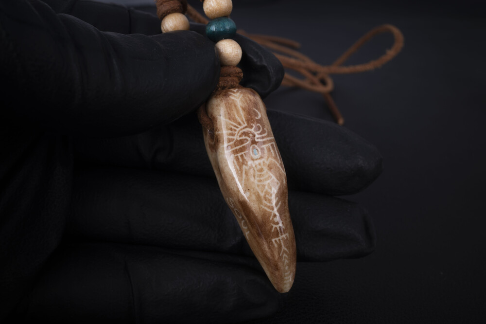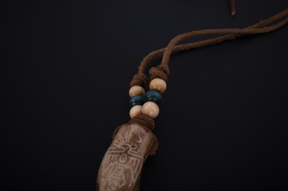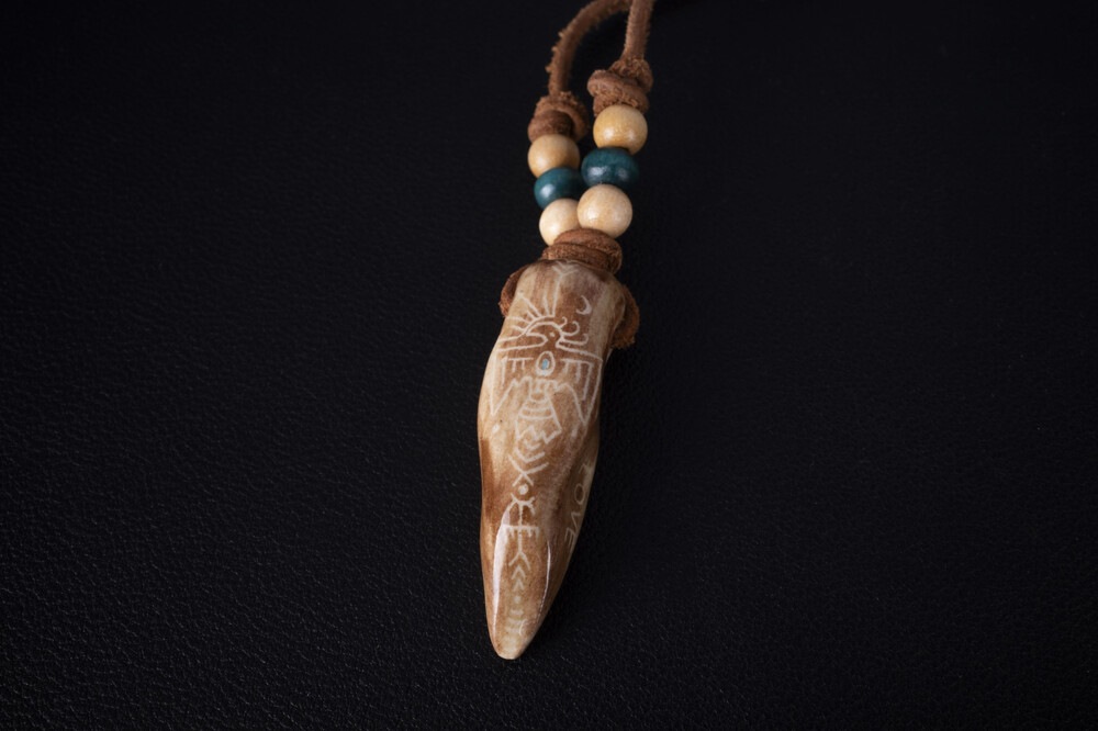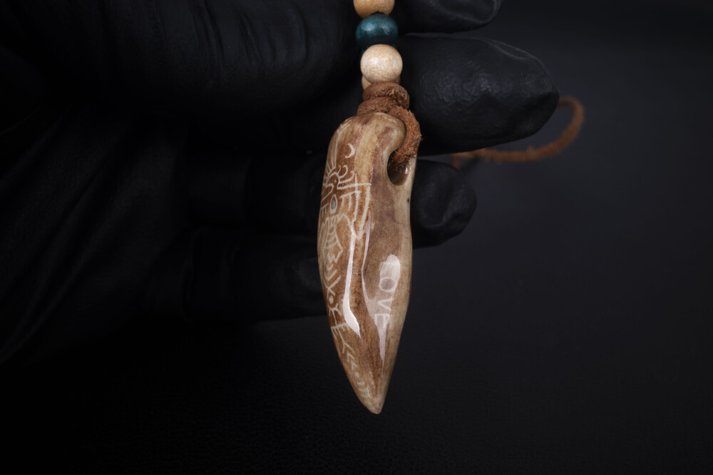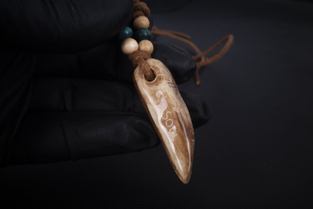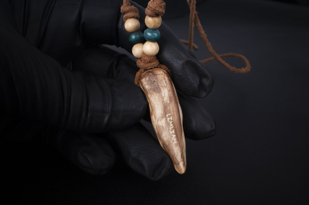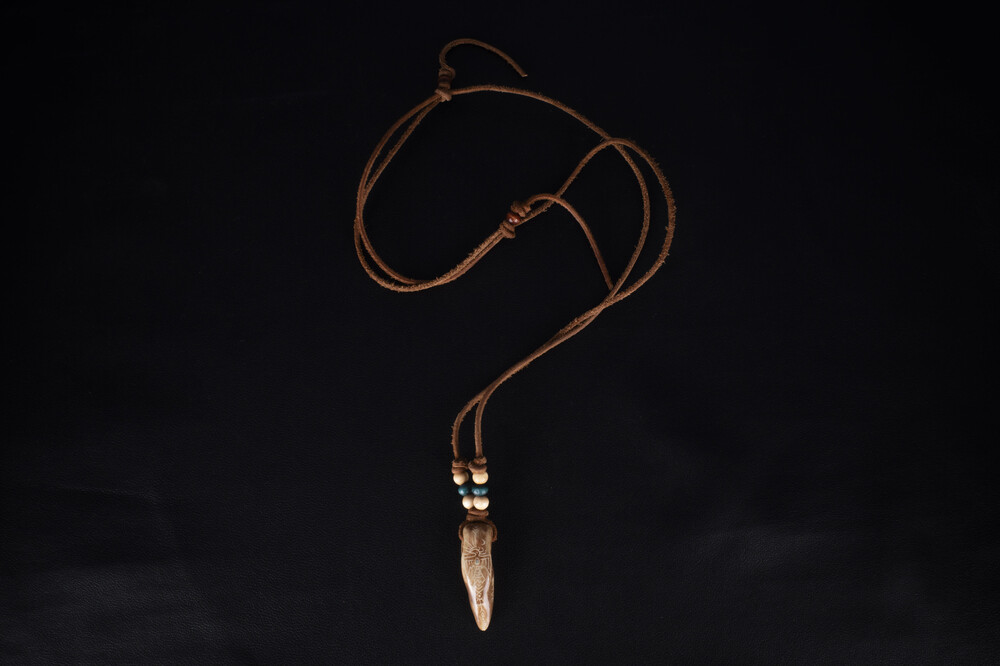 도자/세라믹으로 제작된 이빨 펜던트입니다. 도자를 긁어 무늬를 내서 디자인되는 목걸이 입니다. 가죽줄과 비즈로 구성된 제품입니다.