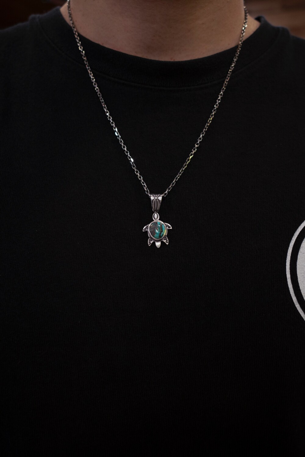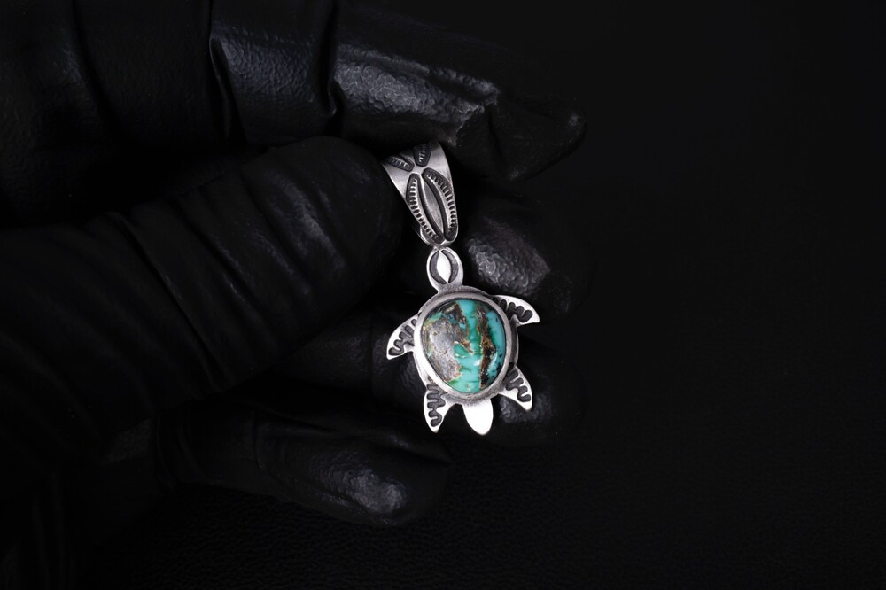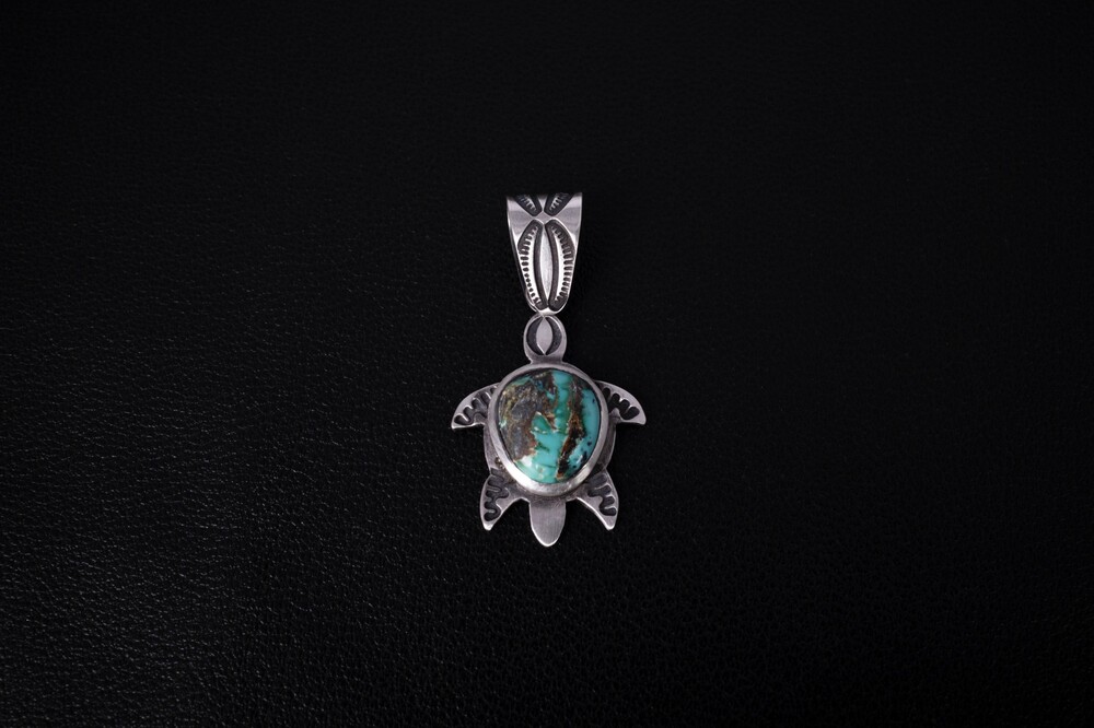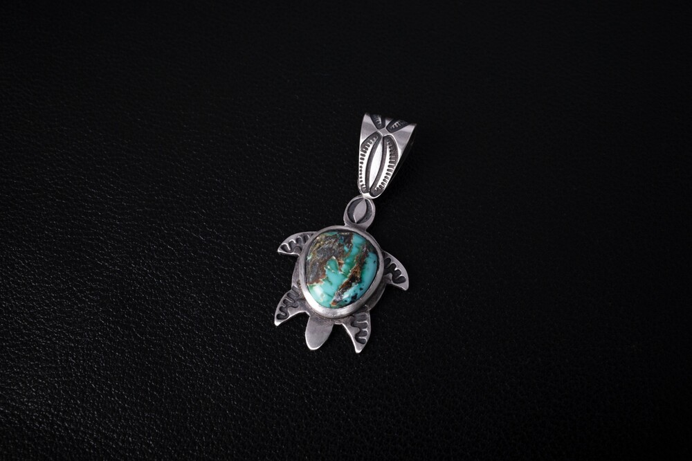 네이티브아메리칸스타일 디자인으로 제작된 거북이 펜던트입니다. 스템핑/세공기법으로 제작되었으며, 메인에는 천연터키석이 세팅된 제품입니다.