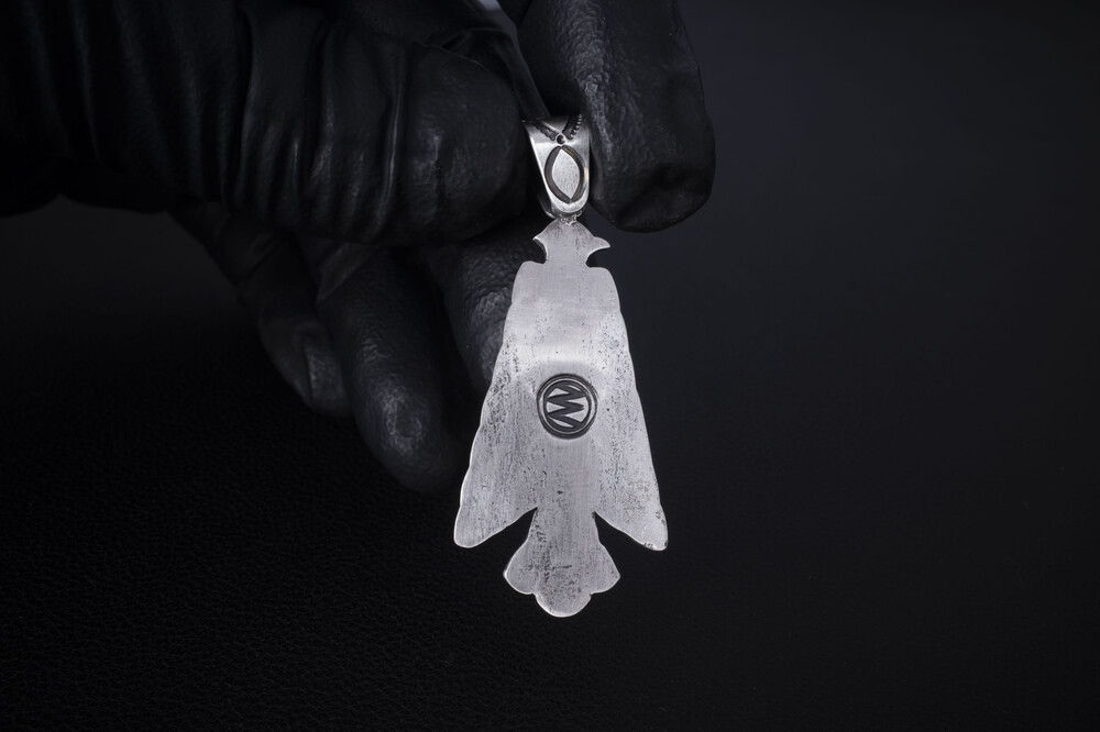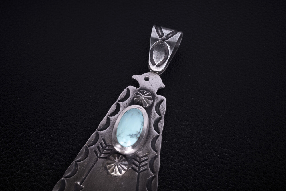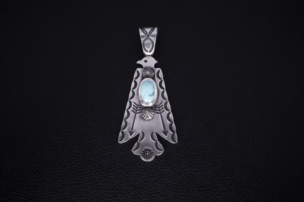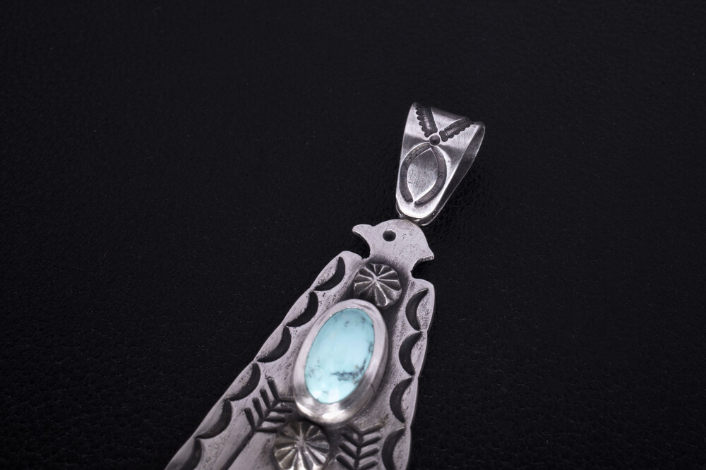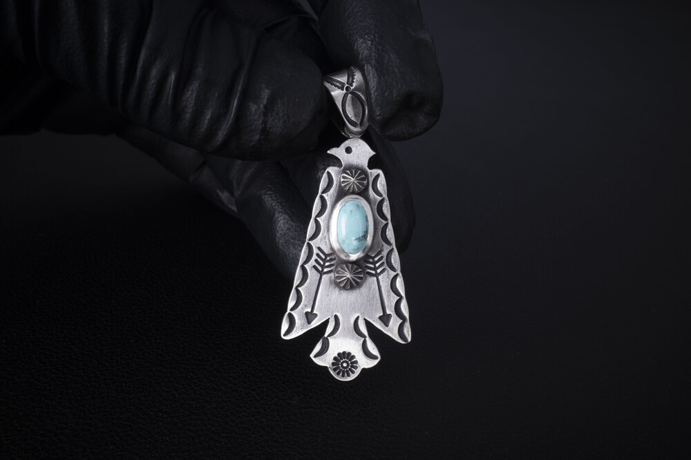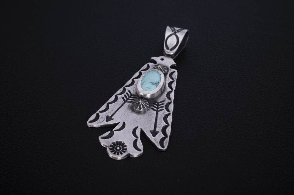네이티브아메리칸 썬더버드디자인으로 제작된 썬더버드 펜던트입니다. 스템핑/세공기법으로 제작되었으며, 메인에는 천연터키석이 세팅된 제품입니다.