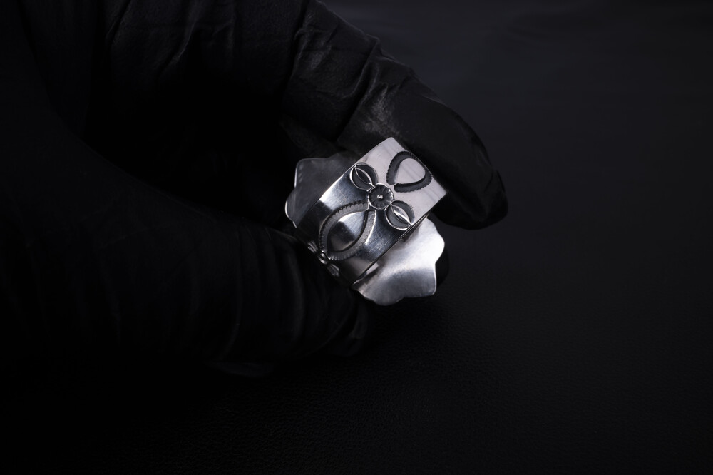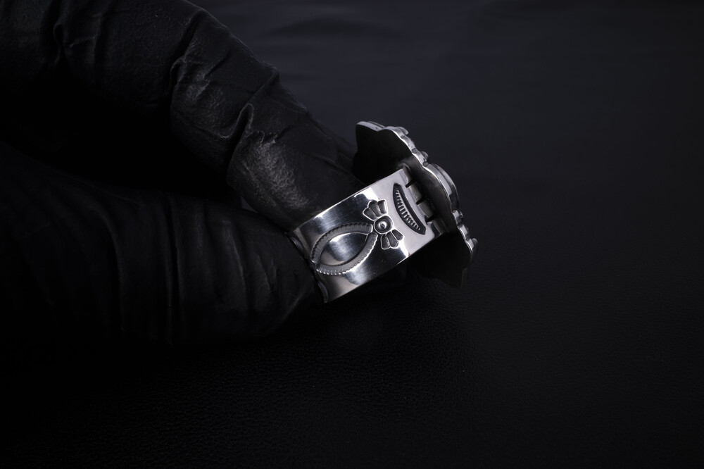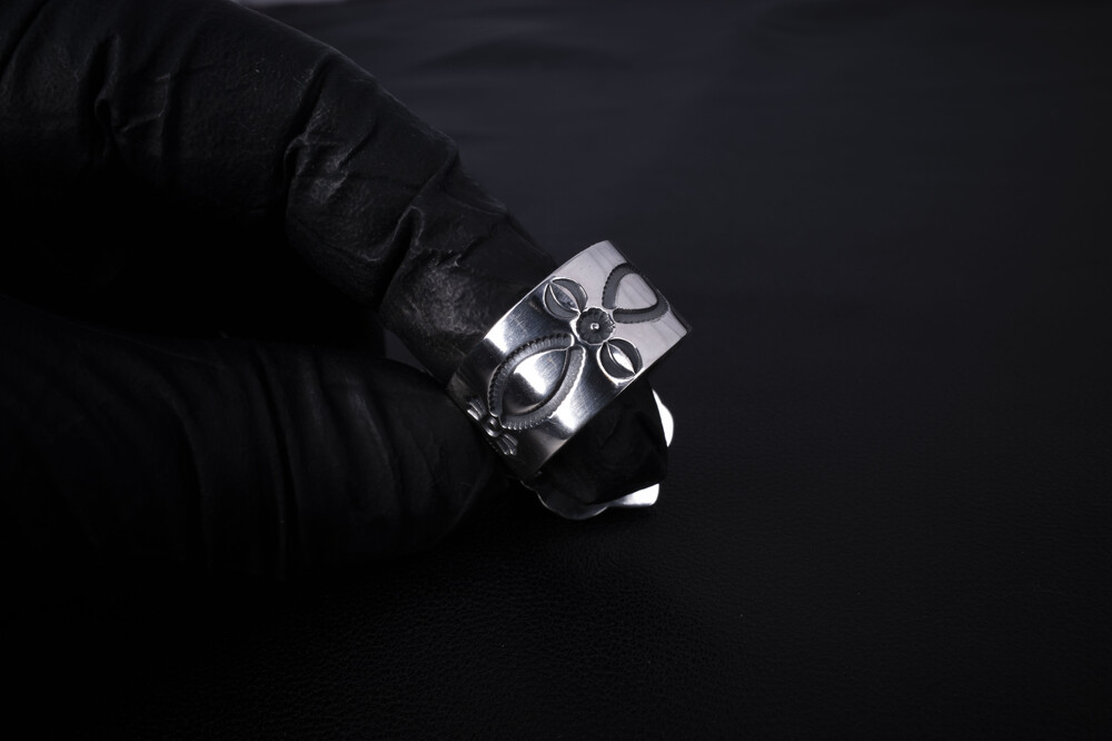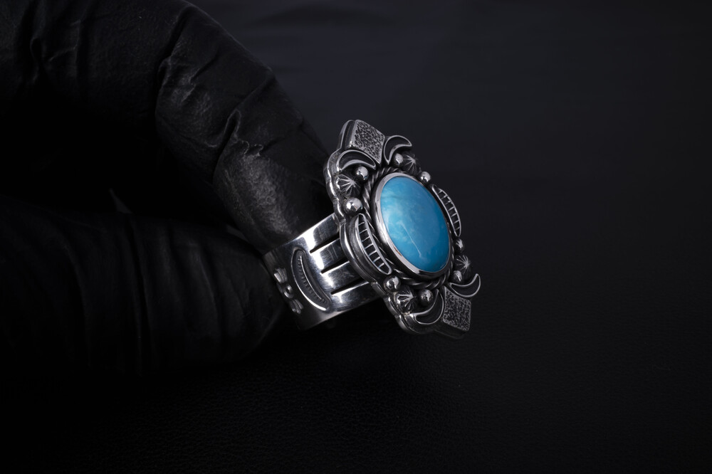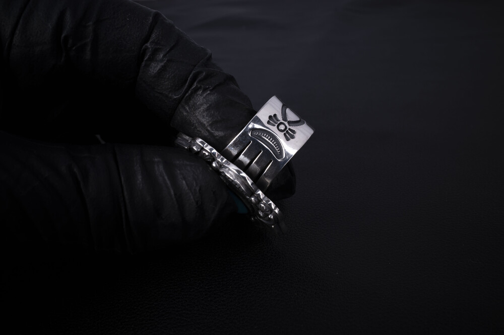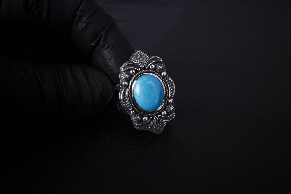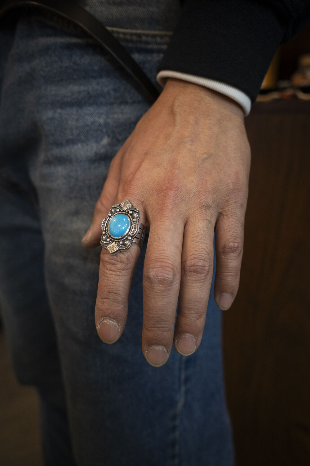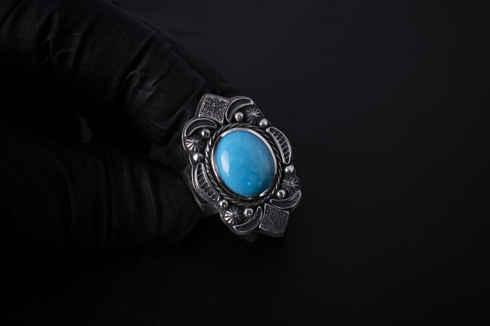 네이티브아메리칸스타일로 제작된 터키석 반지입니다. 스템핑/투각된 여러파즈들을 판재에 올려 제작된 디자인의 반지입니다.