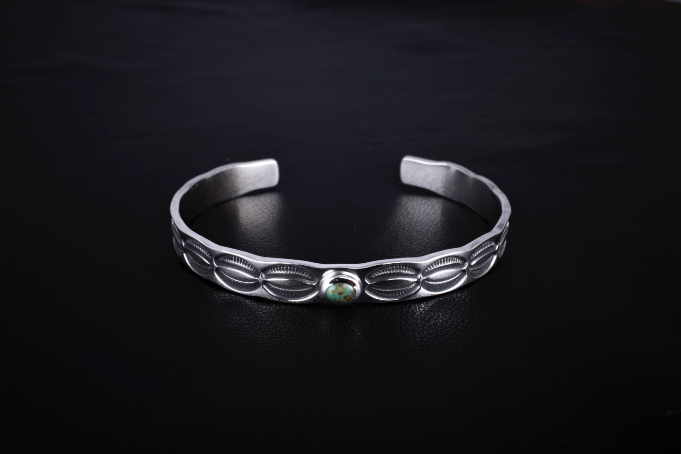 네이티브아메리칸 스타일로 제작된 스템핑 뱅글입니다. 메인에는 천연터키석이 세팅되었으며, 유광마감으로 제작된 제품입니다.