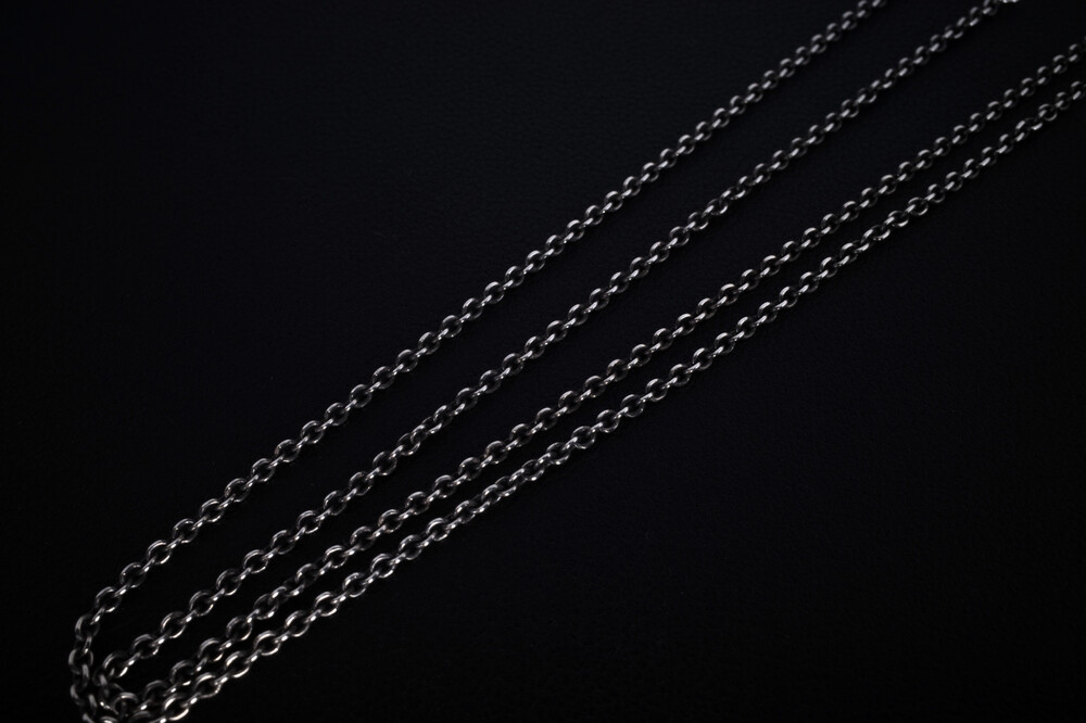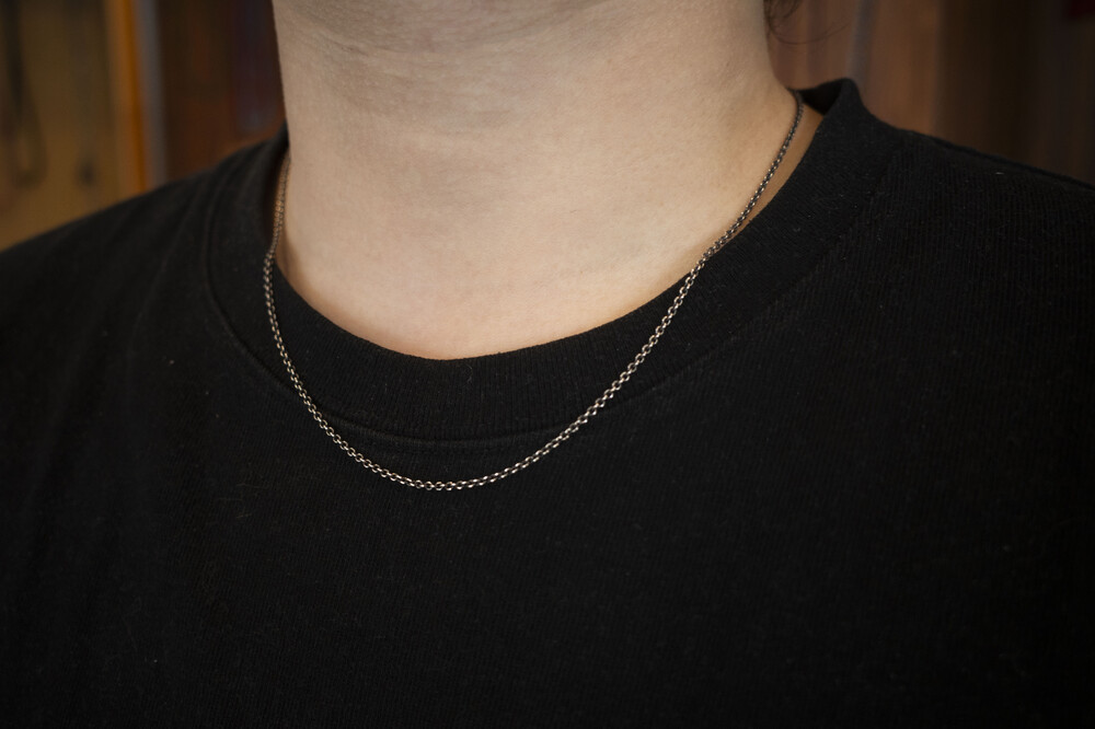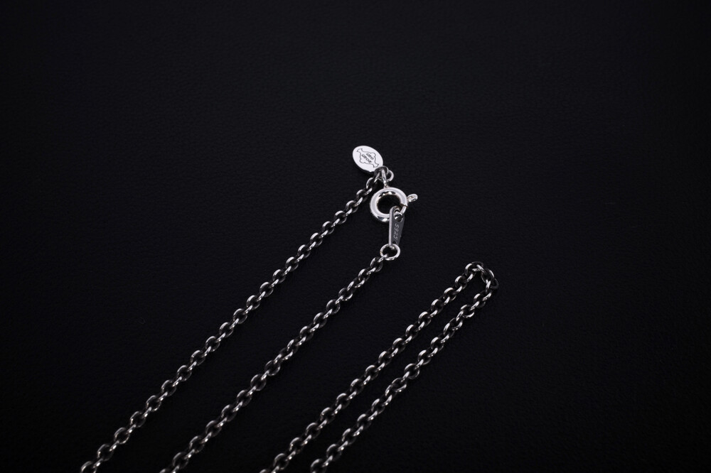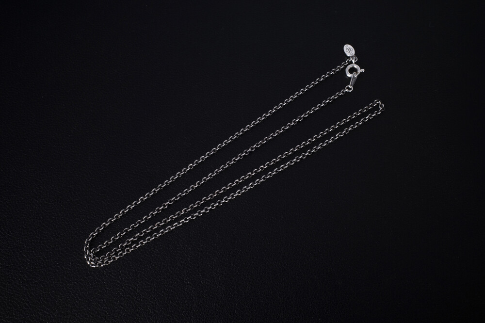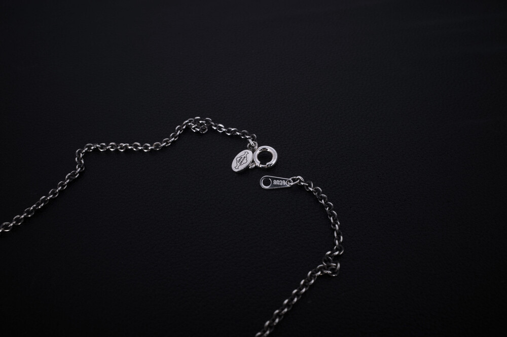 조실버 실버 체인목걸이 타입.2-3 제품입니다. 얇은 타입의 목걸이줄이며, 끝부분은 시그니처 로고가 들어간 메달 디테일이 있는 제품입니다.
