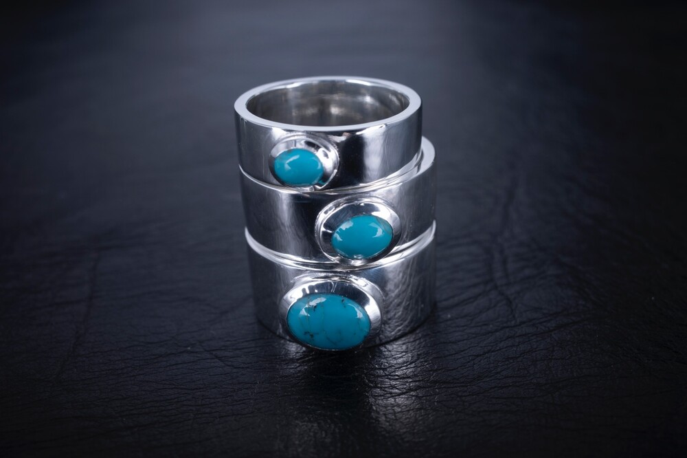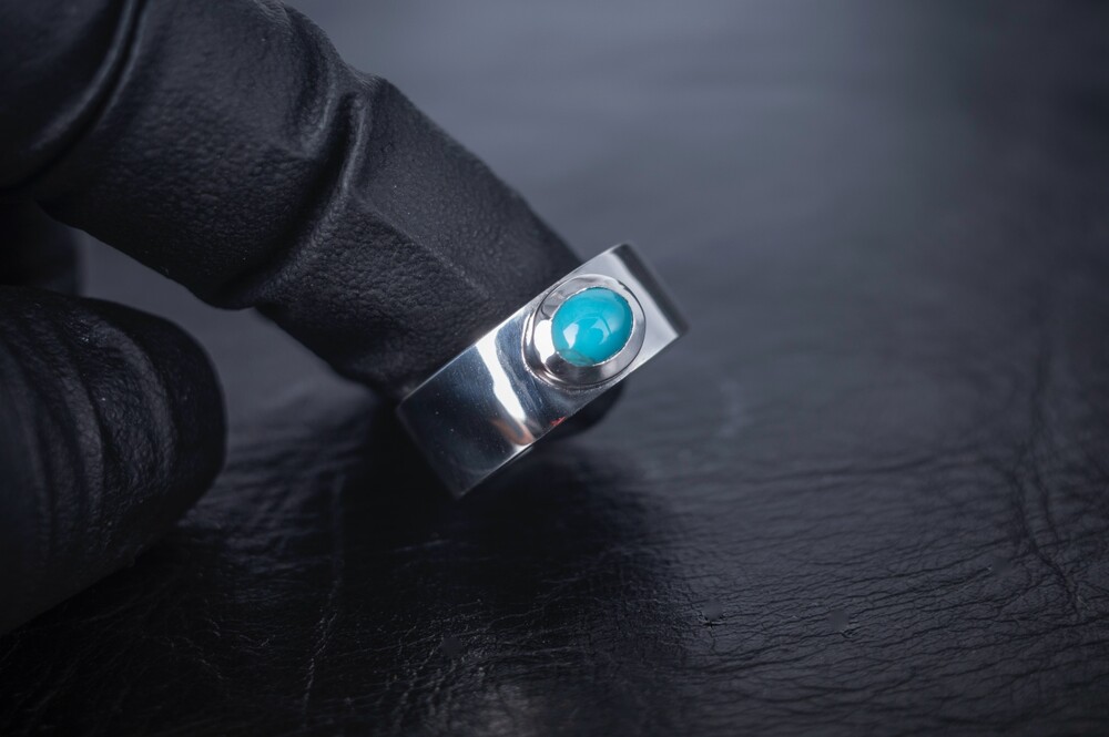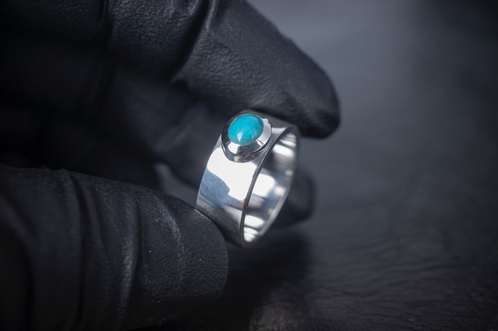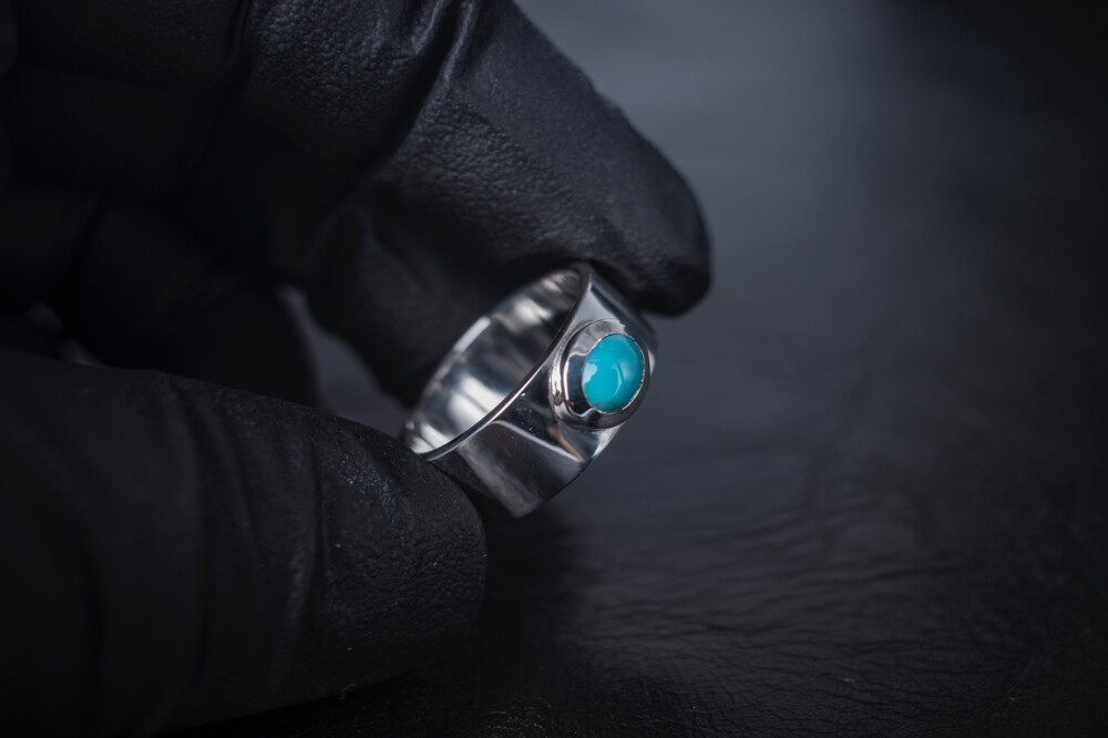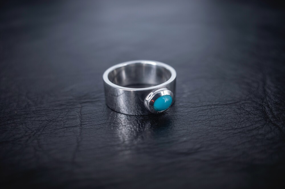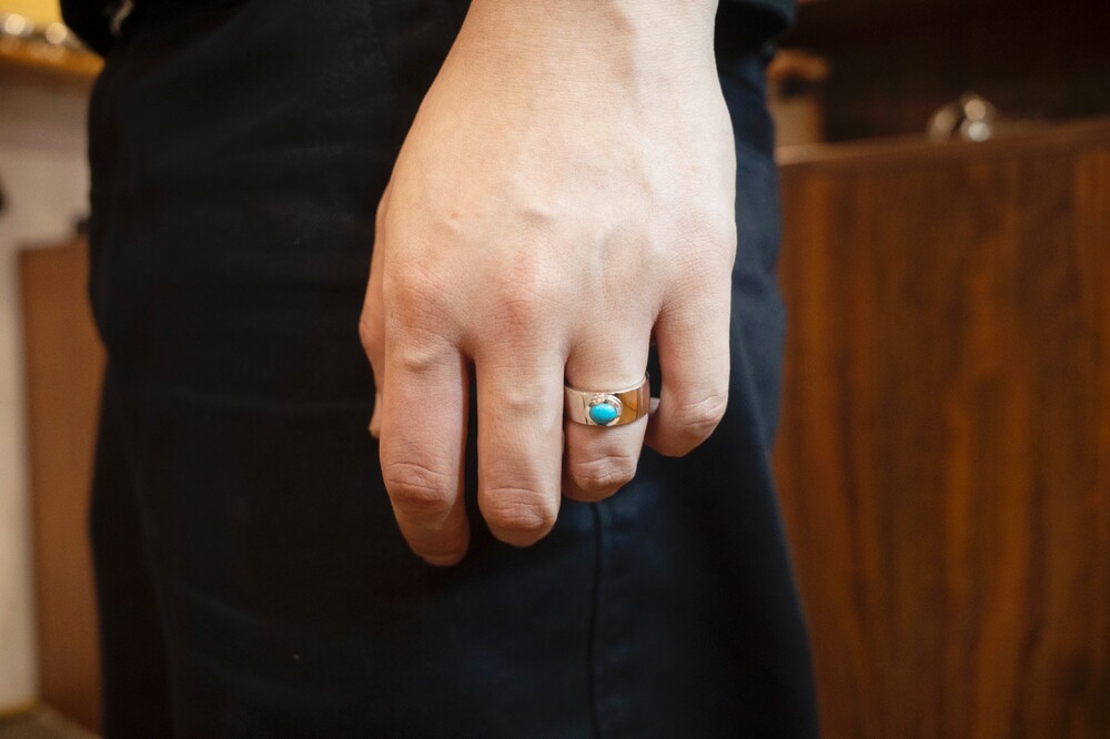 메인에는 터키석이 세팅되어 있으며, 심플한 평반지 형태의 반지에 메인에 터키석이 세팅되는 제품입니다.