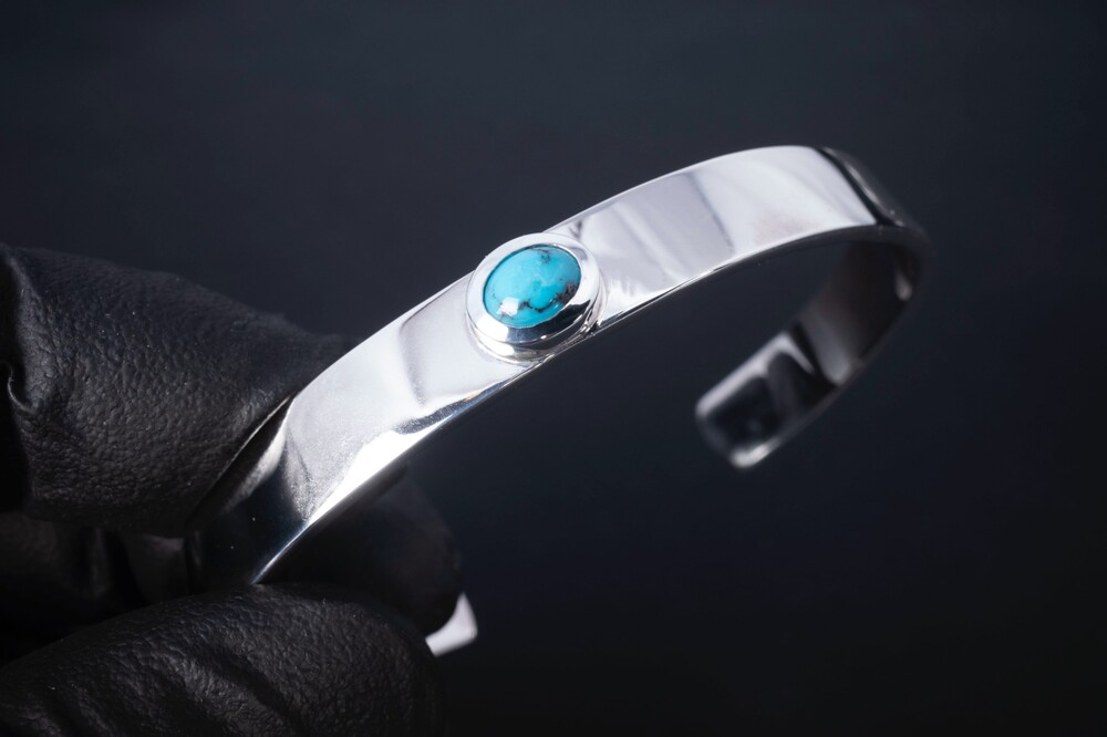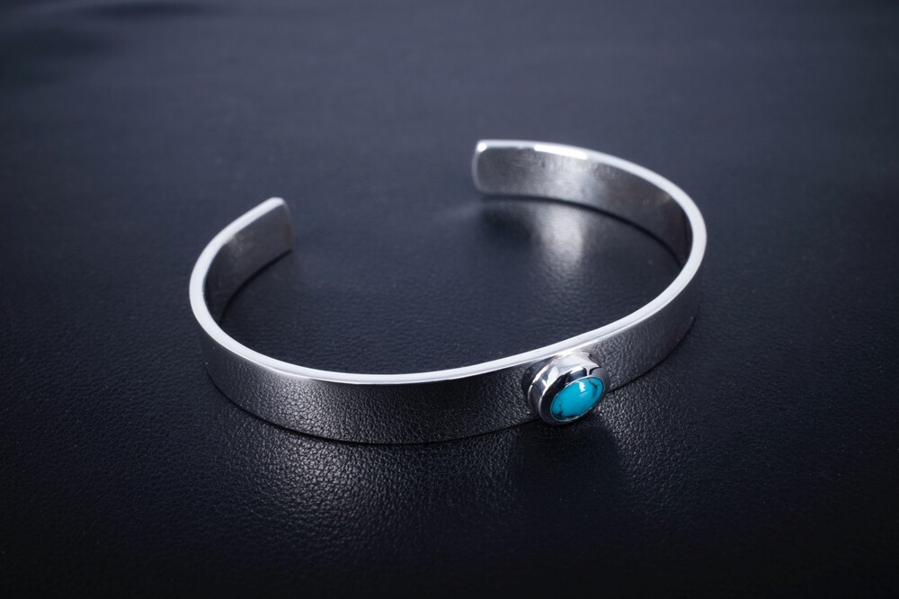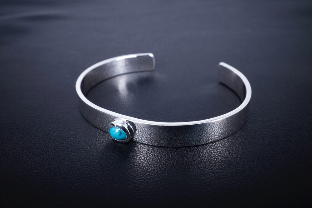 메인에는 터키석이 세팅되어 있으며, 심플한 형태의 뱅글에 메인에 터키석이 세팅되는 제품입니다.