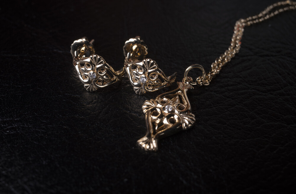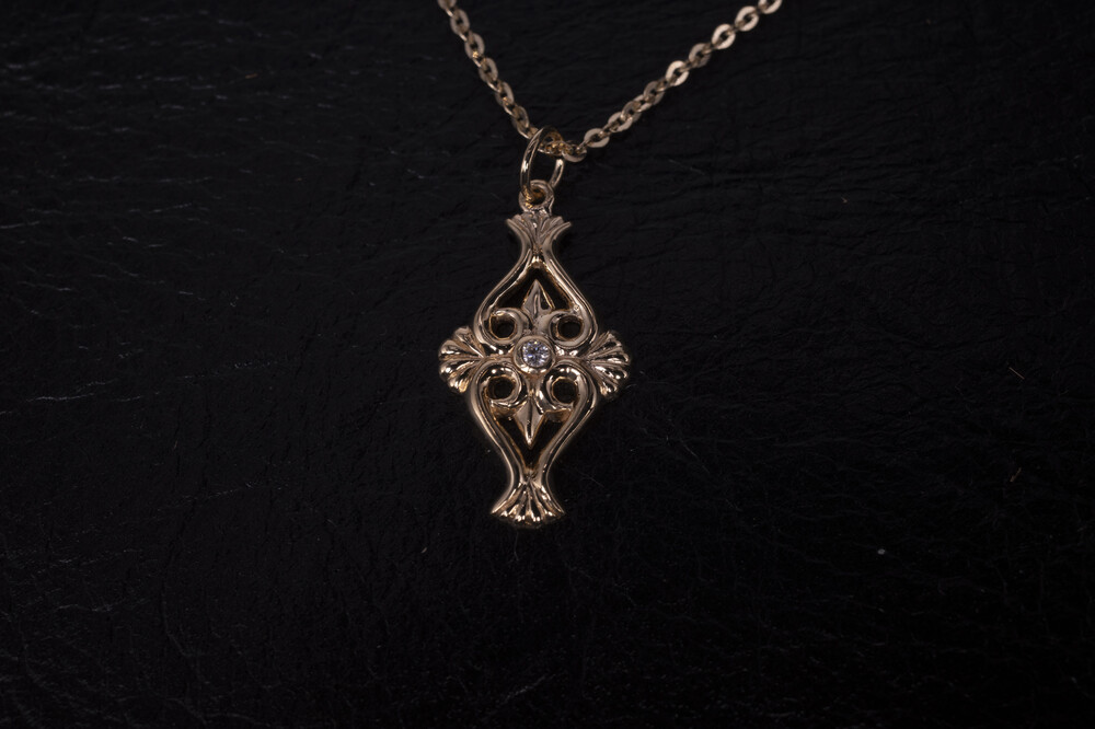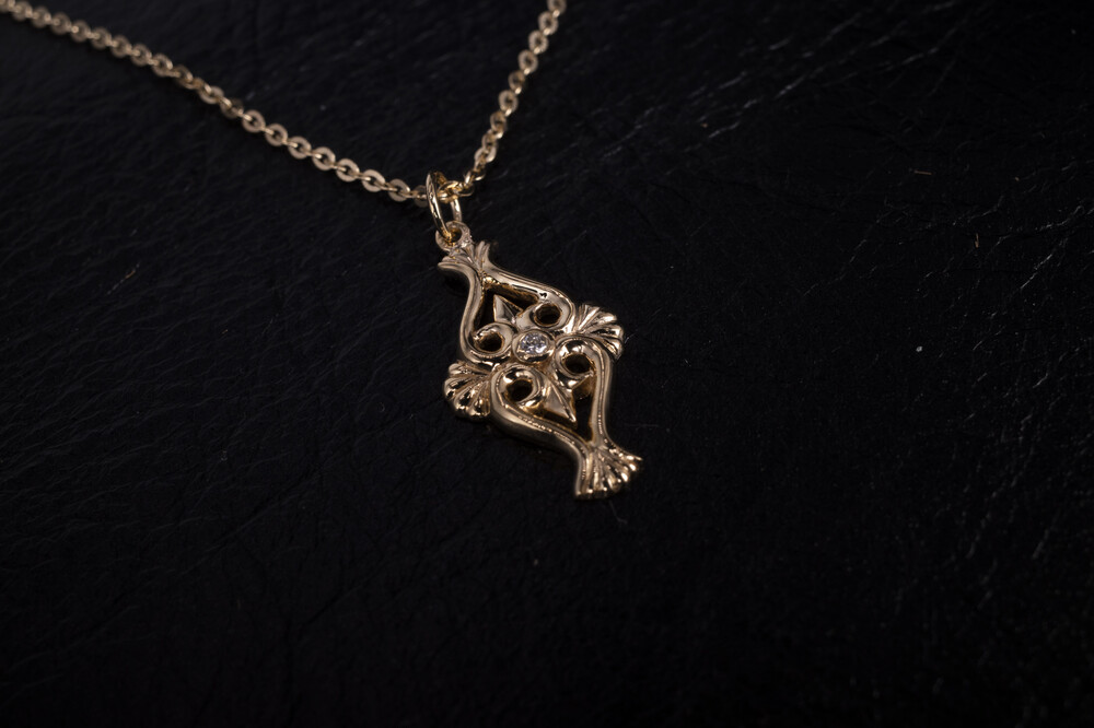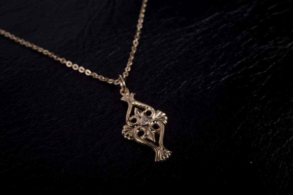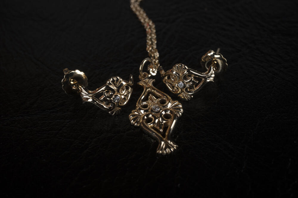 18k 옐로우 골드로 제작되었으며, 메인에는 다이아몬드가 세팅되었습니다. 목걸이와 줄 세트제품입니다.