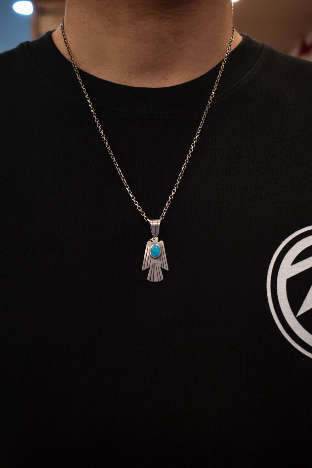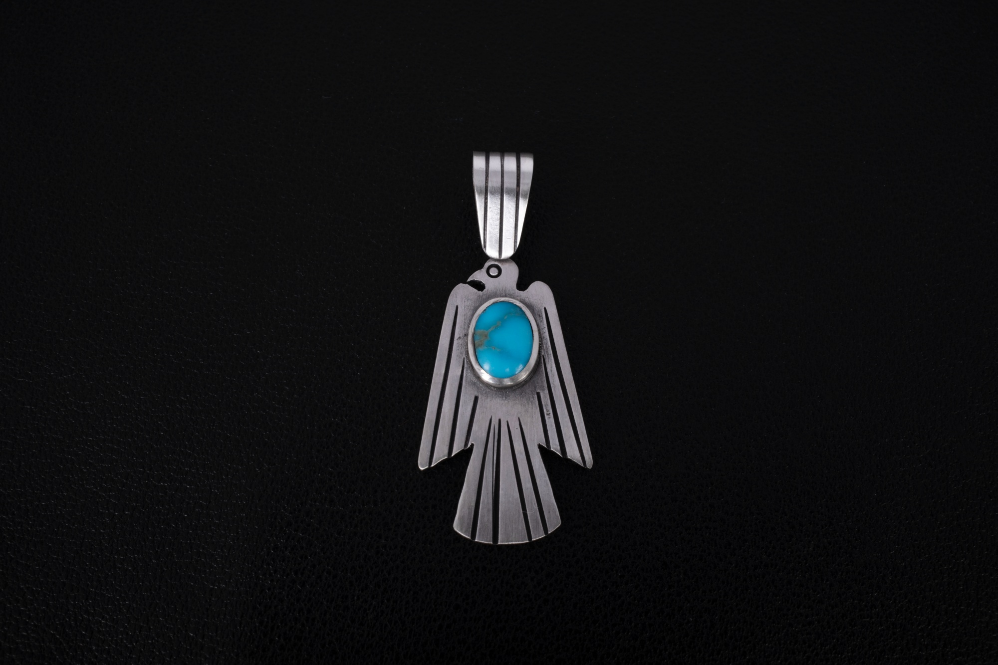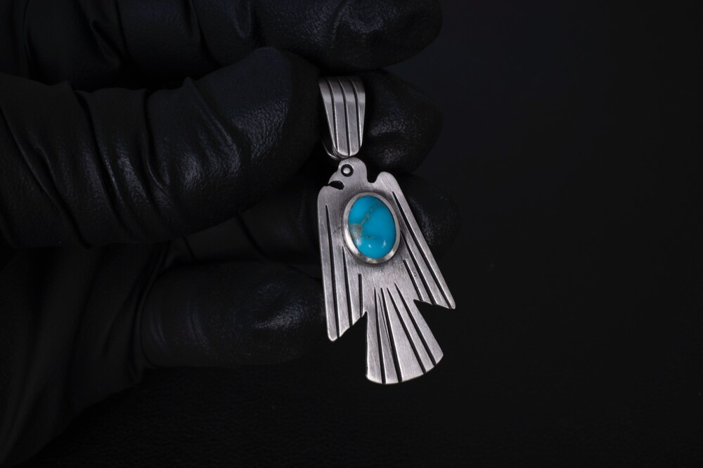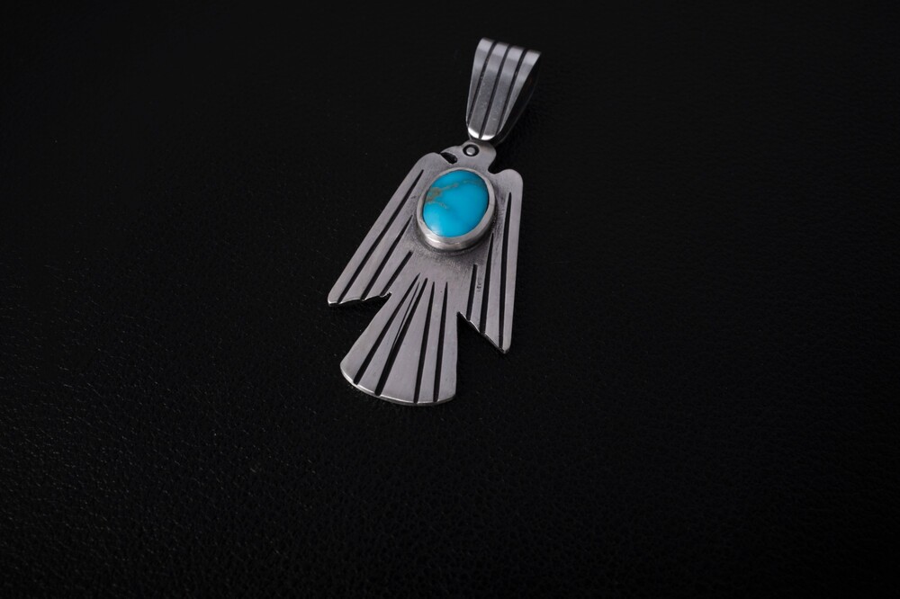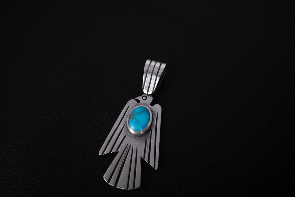 네이티브아메리칸 썬더버드디자인으로 제작된 썬더버드 펜던트입니다. 스템핑/세공기법으로 제작되었으며, 메인에는 천연터키석이 세팅된 제품입니다.
