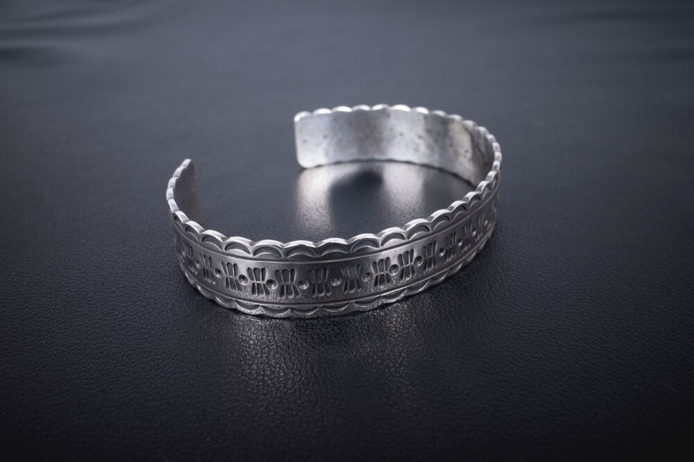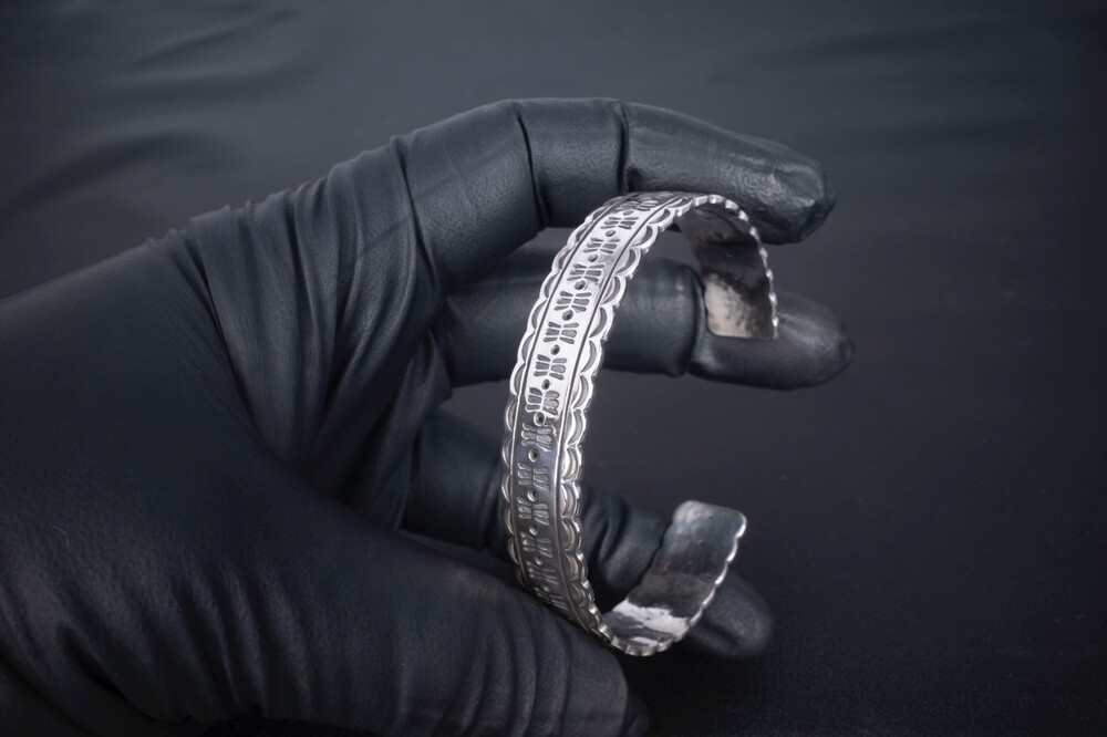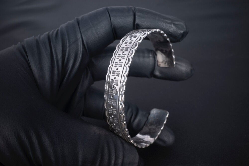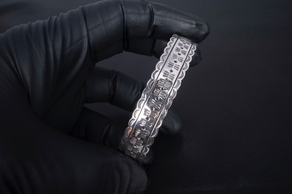 세공기법으로 제작된 뱅글입니다.스템핑 기법을 사용하여 뱅글 전체를 패턴으로 일정하게 찍어 만드는 디자인의 뱅글입니다.