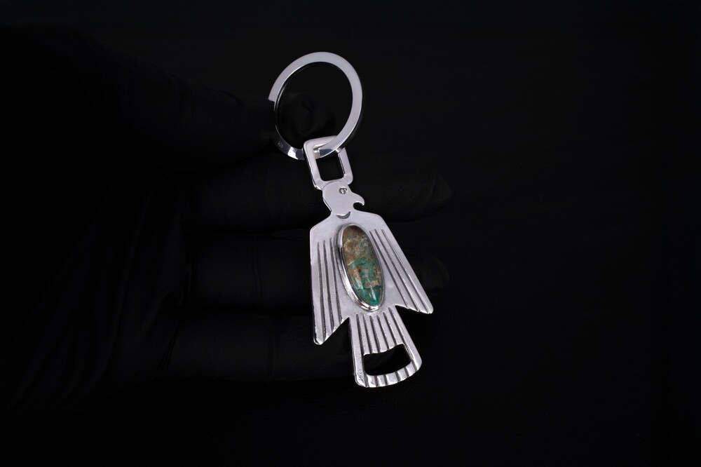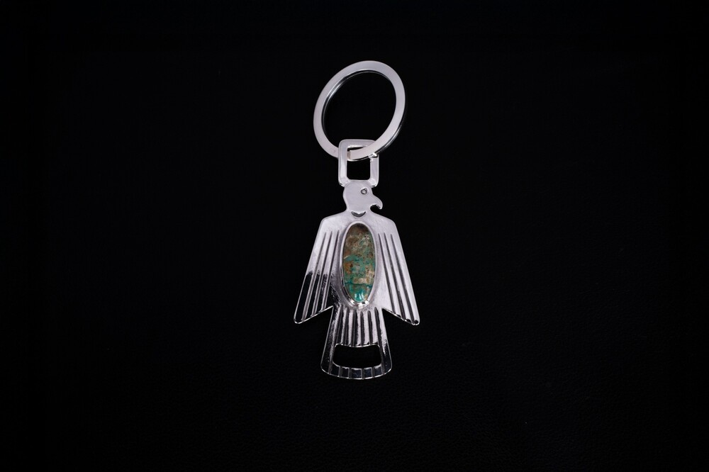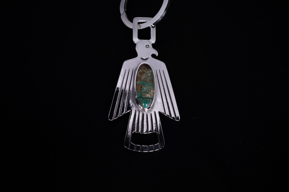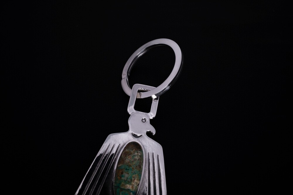 썬더버드 키링입니다. 키후크나 개고리장식과 함께 사용할 수 있는 제품이며, 메인에는 천연터키석이 세팅되었습니다.