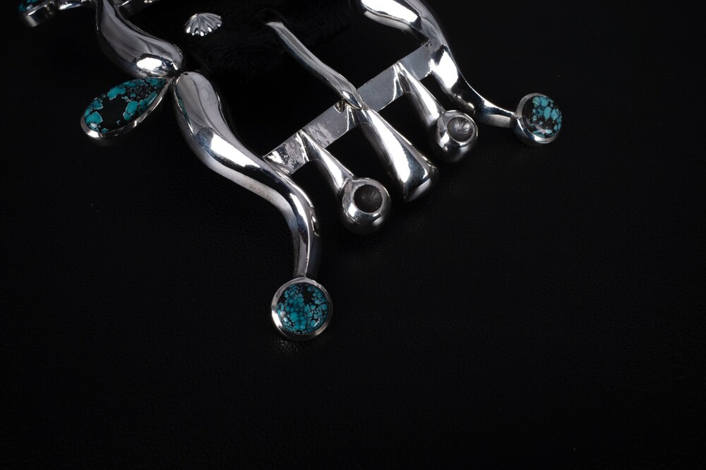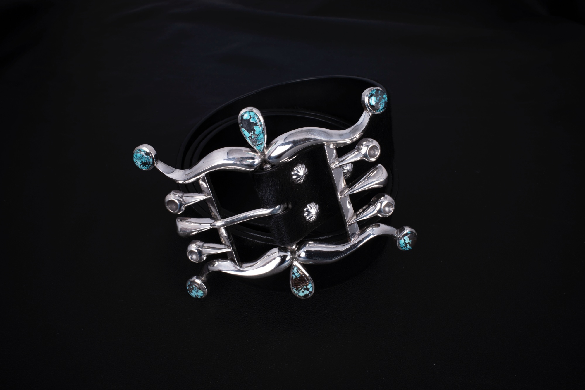 6개의 터키석이 세팅되었으며,볼드한 디자인의 벨트입니다. 벨트스트랩에는 3개의 콘쵸디테일과 송치와 소가죽으로 제작되었습니다.