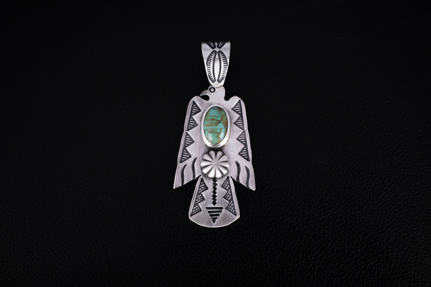 네이티브아메리칸 썬더버드디자인으로 제작된 썬더버드 펜던트입니다. 스템핑/세공기법으로 제작되었으며, 메인에는 천연터키석이 세팅된 제품입니다.