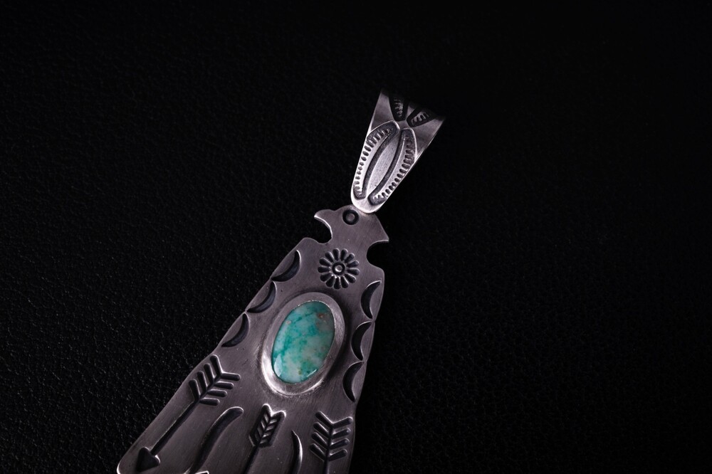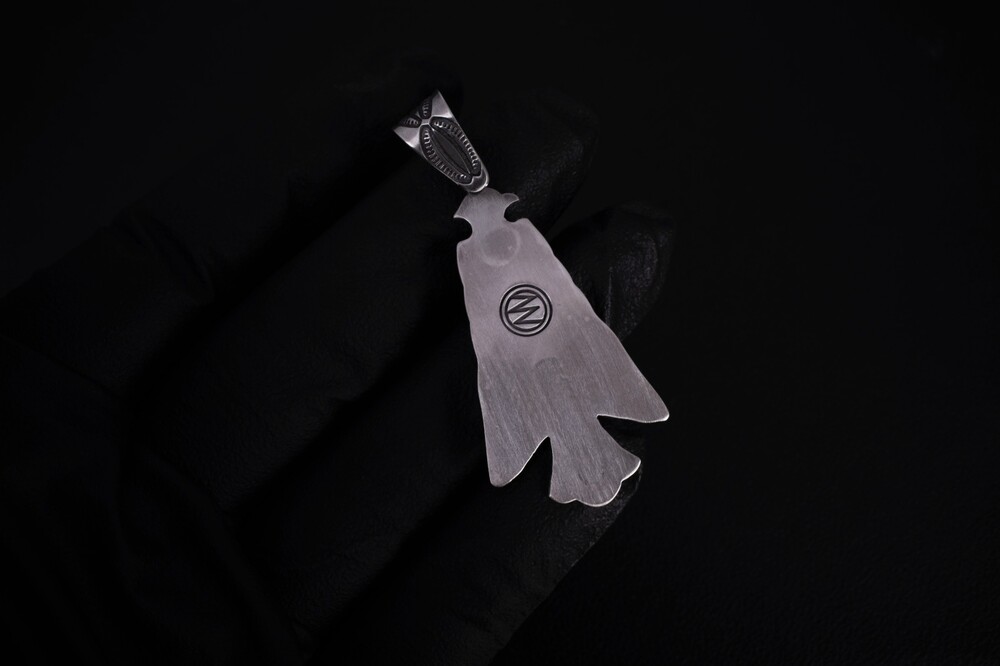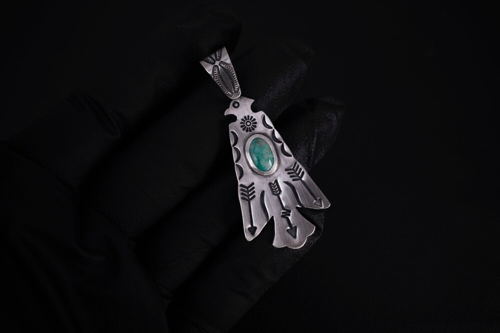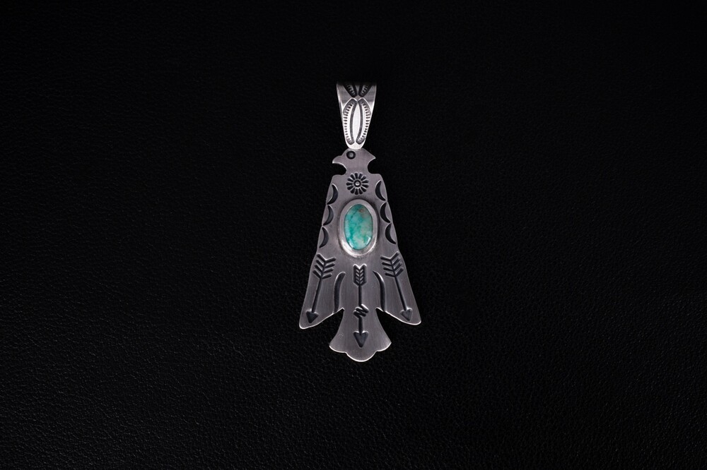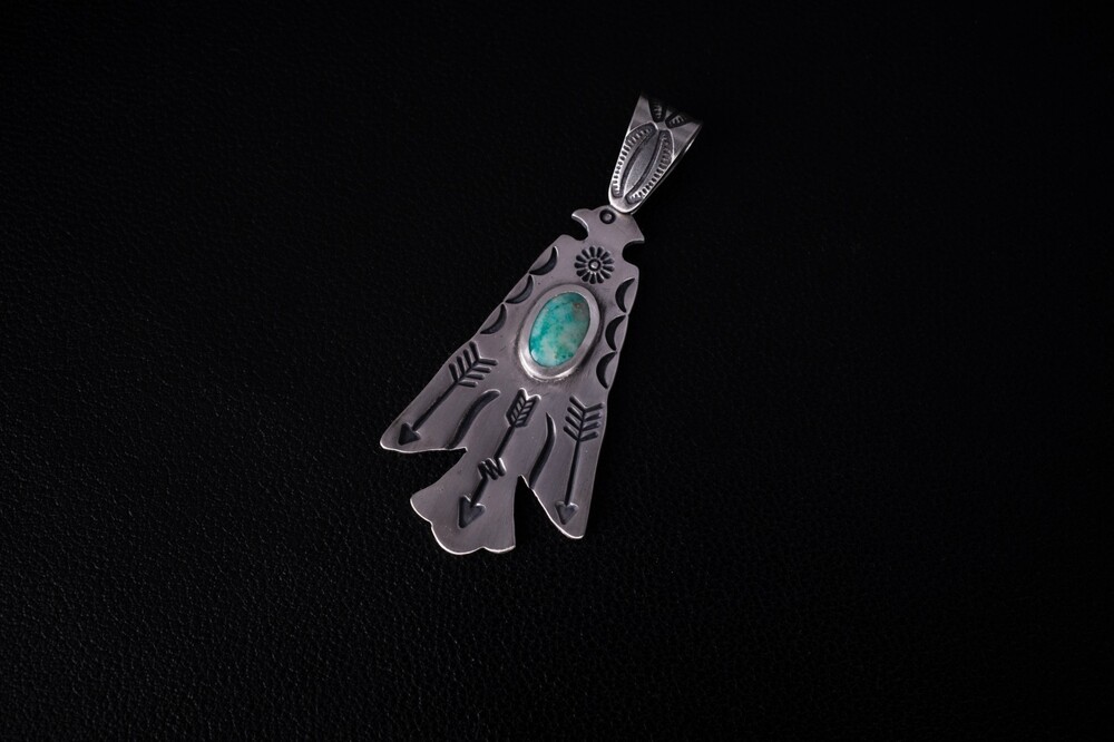 네이티브아메리칸 썬더버드디자인으로 제작된 썬더버드 펜던트입니다. 스템핑/세공기법으로 제작되었으며, 메인에는 천연터키석이 세팅된 제품입니다.