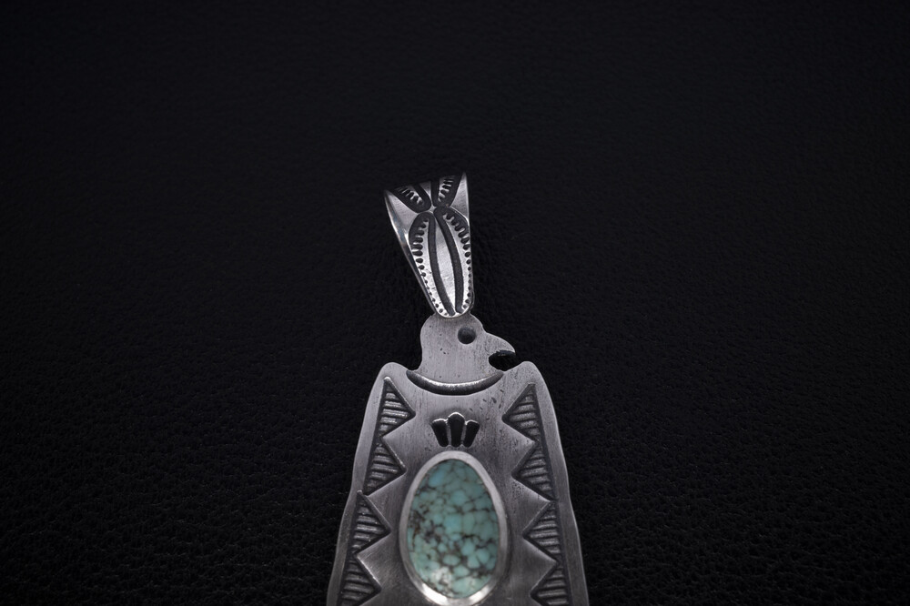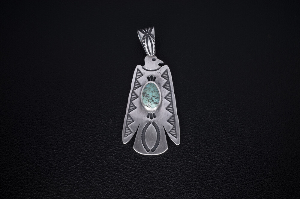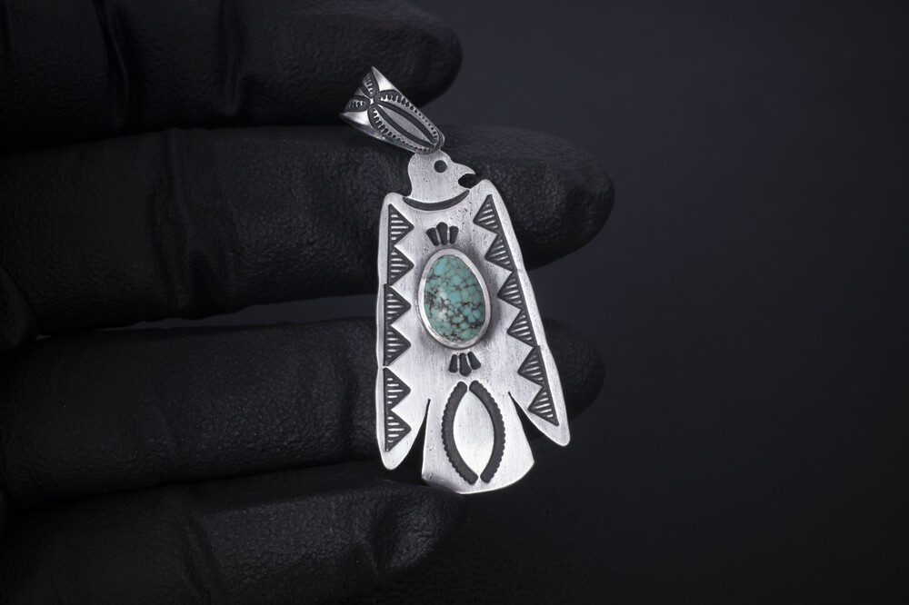 네이티브아메리칸 썬더버드디자인으로 제작된 썬더버드 펜던트입니다. 스템핑/세공기법으로 제작되었으며, 메인에는 천연터키석이 세팅된 제품입니다.